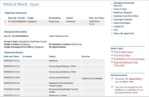 答:用戶可以通過訪問新加坡EMS的網(wǎng)站:http://www.speedpost.com.sg/TrackAndTrace.asp 查詢貨物軌跡。
