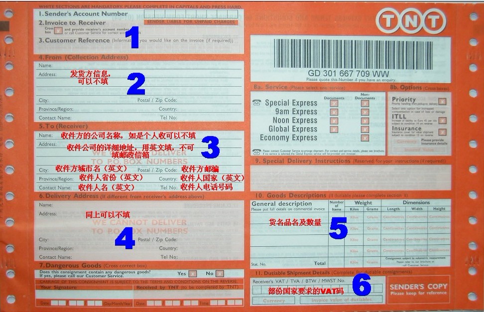 4.TNT面單務必用整潔的英文字母填寫,需寫明晰收件人地址、電話、郵編。